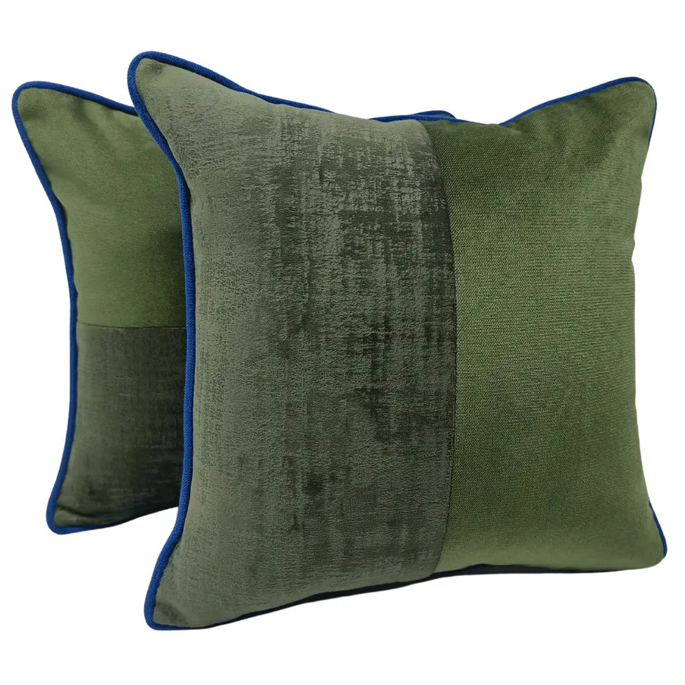 Add a touch of luxury with these Forest Green & Velvet Accent Pillow Covers, blending rich green tones with a subtle textured contrast. The bold blue piping enhances the elegance, making them a stylish choice for sofas, chairs, or beds. Perfect for indoor spaces, combining comfort with modern sophistication.