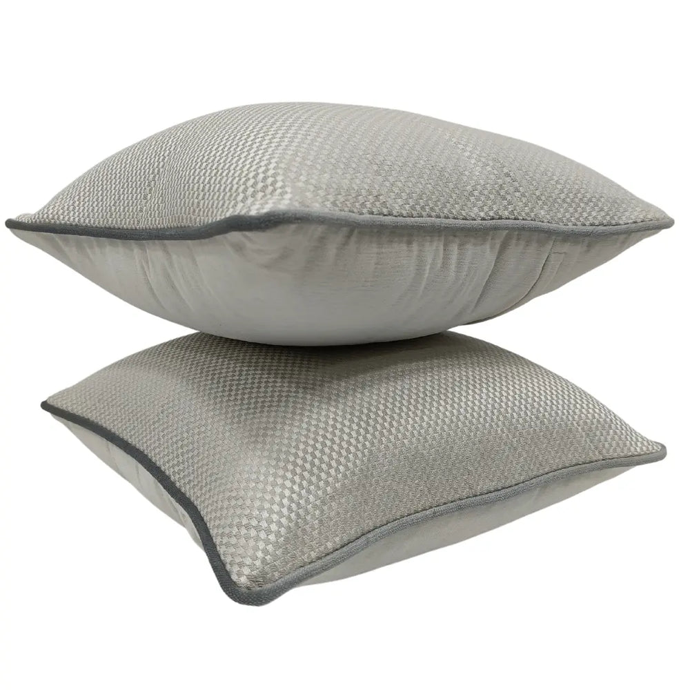 Add a touch of elegance to your indoor space with these silver pillow covers, featuring a subtle geometric texture and soft grey piping. Perfect for enhancing your living room or bedroom decor with a refined and modern aesthetic.