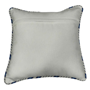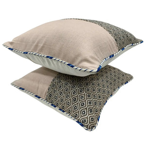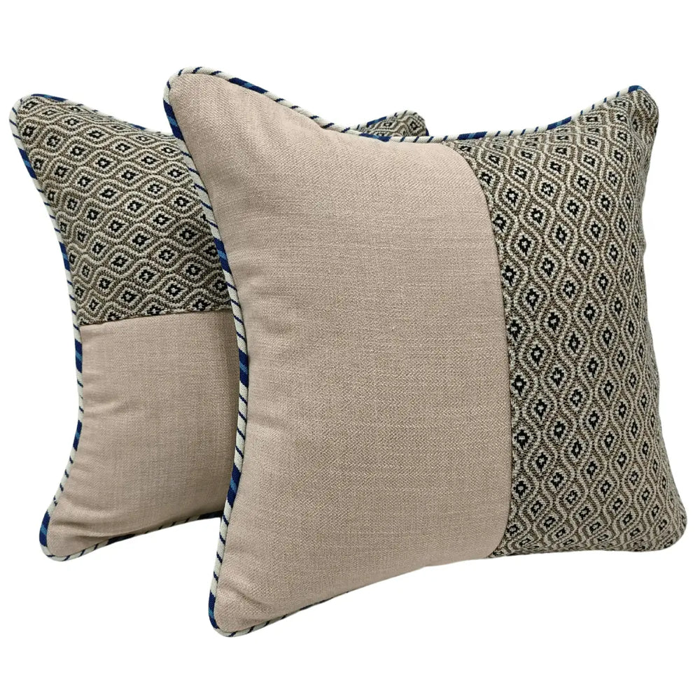 Soft beige panels contrast beautifully with an intricate geometric diamond pattern, creating a balanced blend of texture and design. Navy and white striped piping adds a refined touch, making these pillow covers a versatile addition to any indoor space.