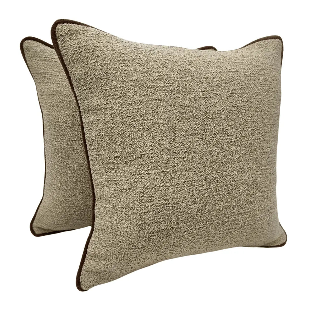 These pillow covers feature a soft and cozy beige bouclé fabric with warm brown piping. Perfect for adding a natural and inviting touch to indoor spaces, ideal for sofas, beds, or lounge areas.