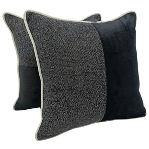 These pillow covers feature a striking patchwork design in deep black and charcoal gray, combining soft textures with a modern aesthetic. Framed with crisp white piping, they bring contrast and sophistication to any indoor space. A stylish addition to contemporary or classic decor.