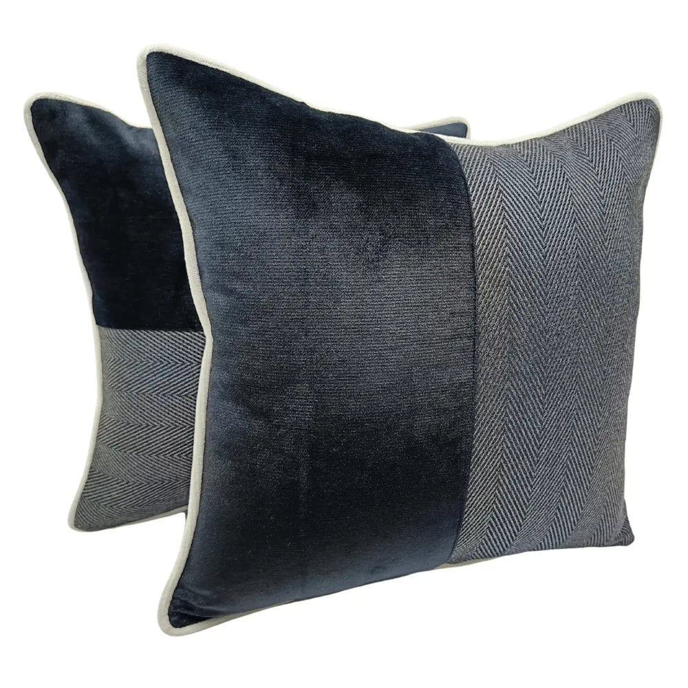 These pillow covers feature a sophisticated blend of rich black velvet and elegant grey herringbone fabric, accented by soft white piping. Ideal for adding a modern and refined touch to indoor spaces, perfect for sofas, beds, or accent chairs.