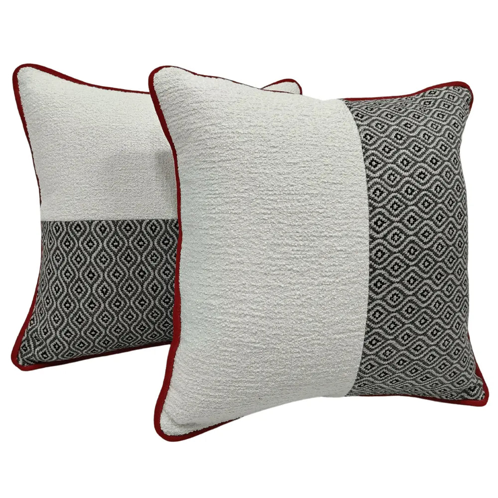 Add a bold statement to your indoor space with these black and white geometric pillow covers. Featuring a textured blend of boucle and patterned fabric, accented by vibrant red piping, these 16x16 cushions bring modern style and comfort to your living area. Ideal for sofas, chairs, and bedrooms.