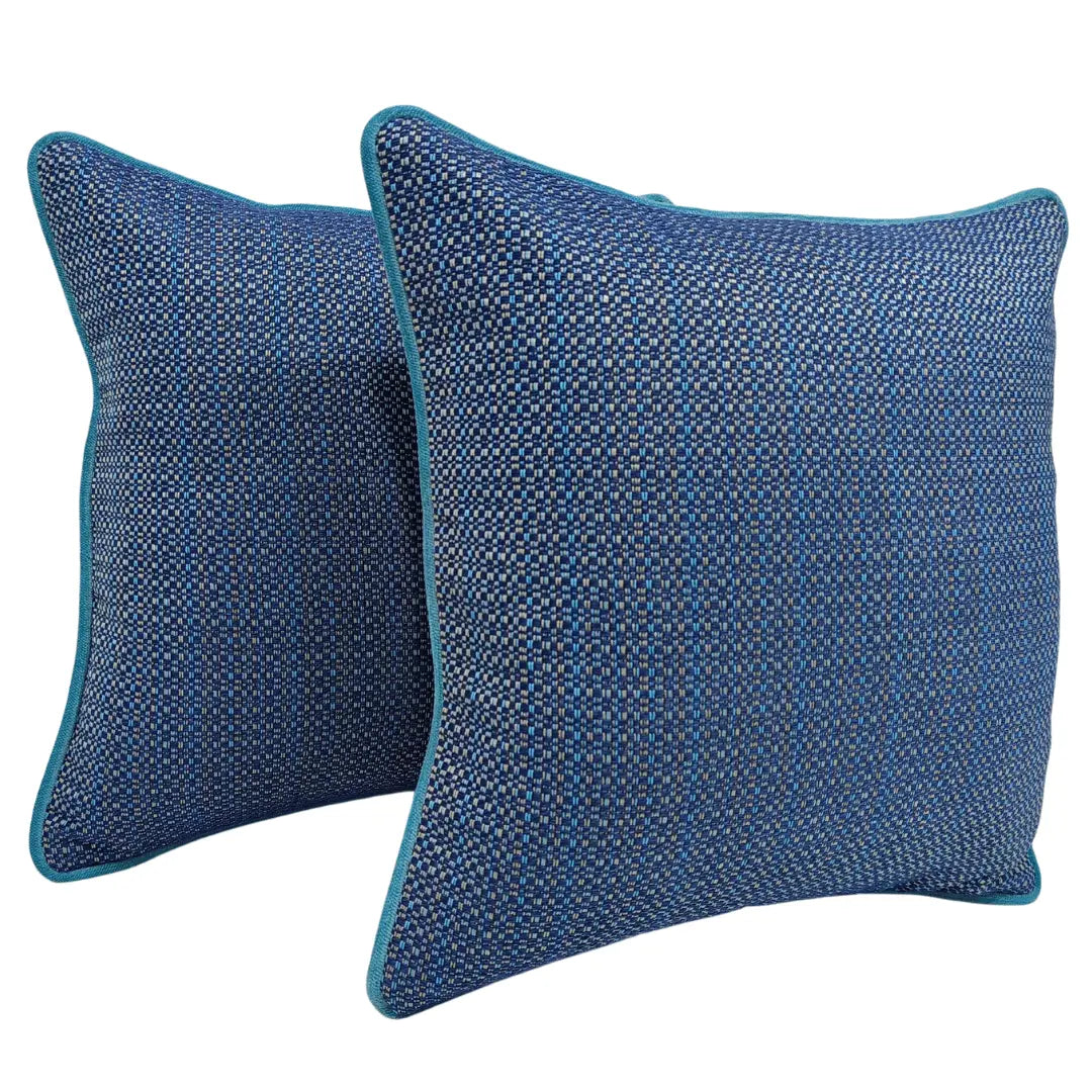 Elevate your indoor or outdoor space with these 16x16 pillow covers featuring a vibrant blue woven pattern and teal piping. Durable and stylish for any setting.