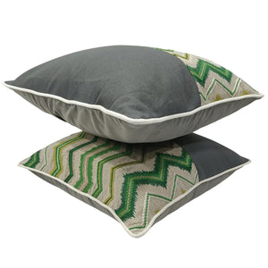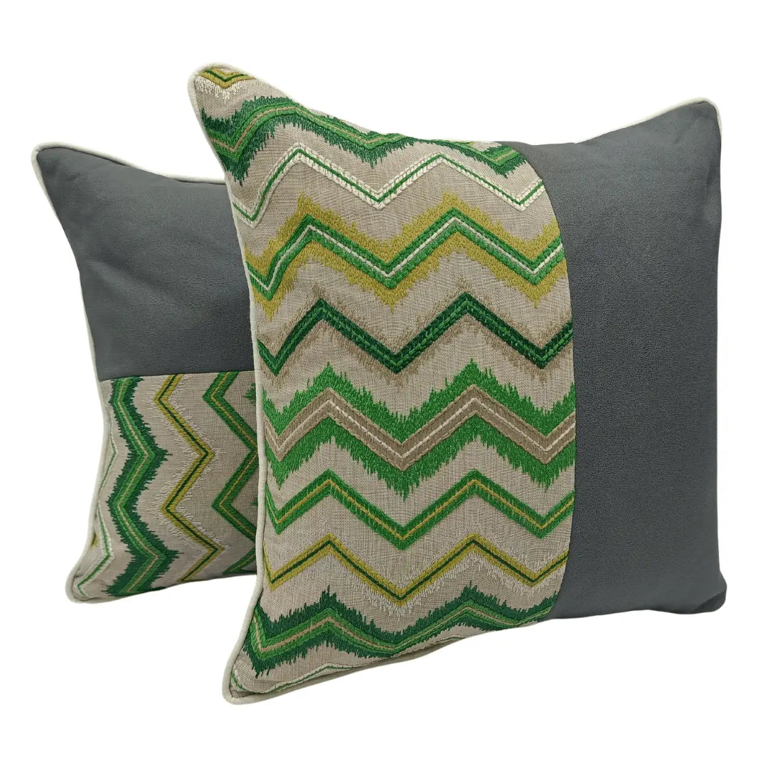Elevate your home décor with these stylish pillow covers featuring a striking chevron pattern in shades of green, gold, and beige, paired with a sleek gray panel. The intricate woven design adds texture and depth, while the neutral tones ensure versatility in any indoor space.
