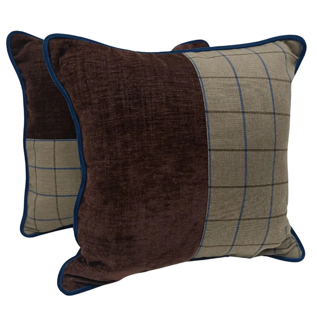 A perfect blend of tradition and luxury, these pillow covers feature a stylish plaid pattern complemented by deep coffee brown velvet. The contrasting blue piping adds a refined touch, making them a versatile addition to classic and modern interiors alike.