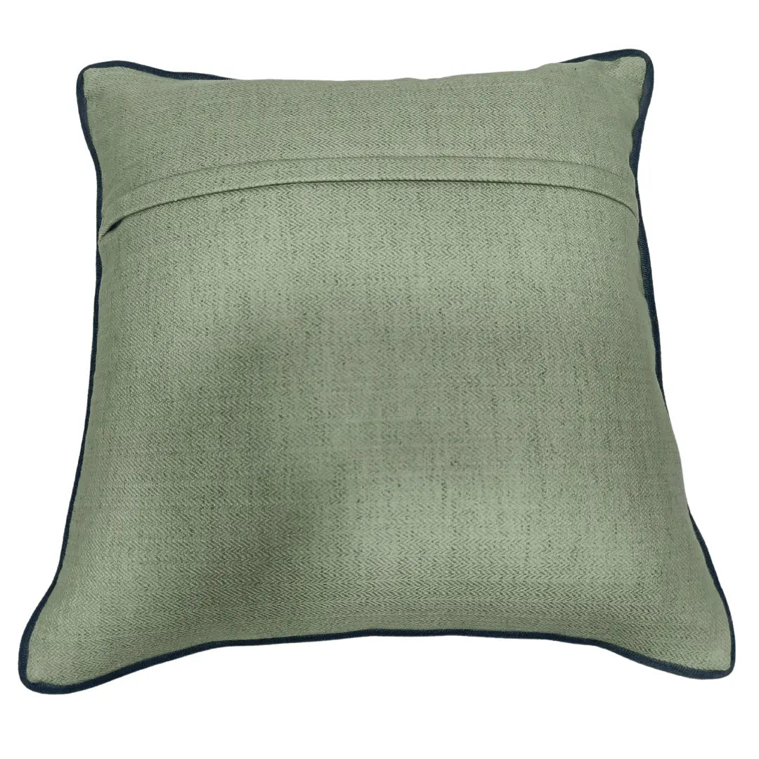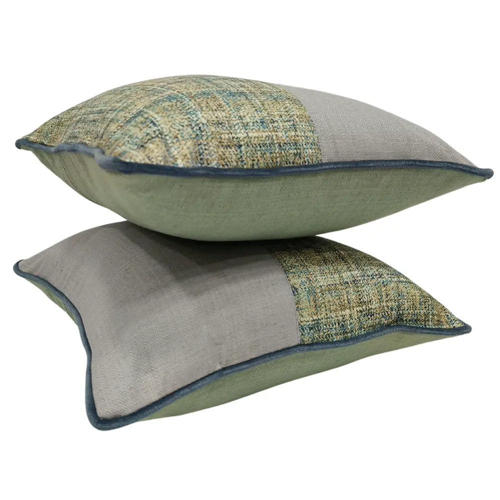 Add a sophisticated touch to your indoor space with these contemporary cushion covers featuring a harmonious blend of soft beige fabric and textured green patterned panels. The subtle blue piping enhances the design, creating a refined and elegant look. Perfect for modern, bohemian, or classic interiors.