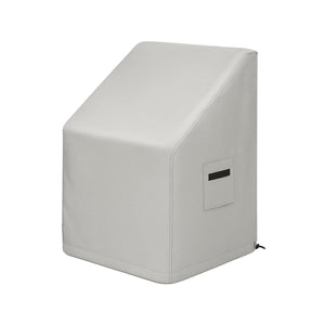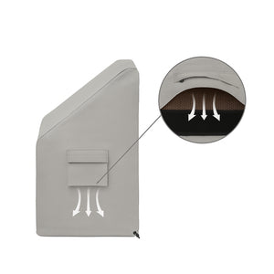 Integrated handles at natural lifting points allow easy removal. The design accommodates the high chair's elevated profile and legrest extension, preventing wind from getting underneath the cover.