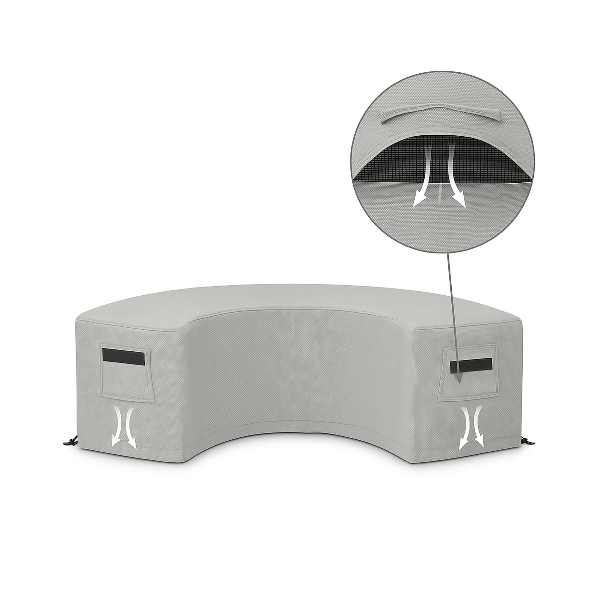 Each curved furniture cover is built from18 oz PVC-coated polyester, ZIPCushions’ signature heavy-duty fabric known for its strength and weather resistance. The PVC layer forms a waterproof barrier, while the UV-stabilized treatment prevents sun damage, discoloration, and cracking.
