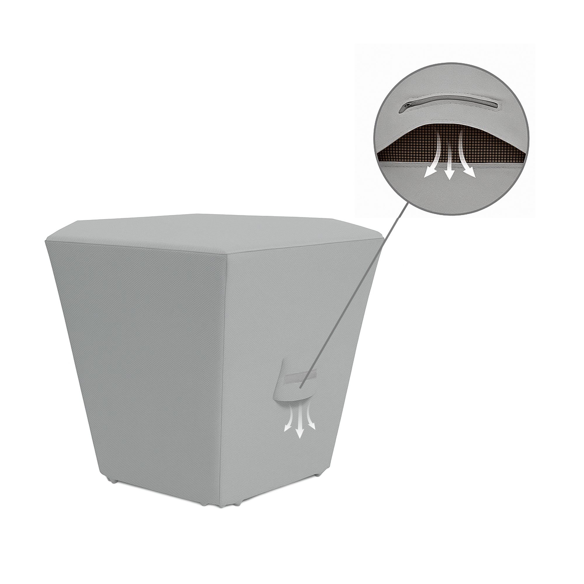 Air vents keep air circulating to prevent mildew or trapped humidity. The drawstring hem locks the cover securely beneath the ottoman even during gusty weather, and sturdy handles make handling easy.