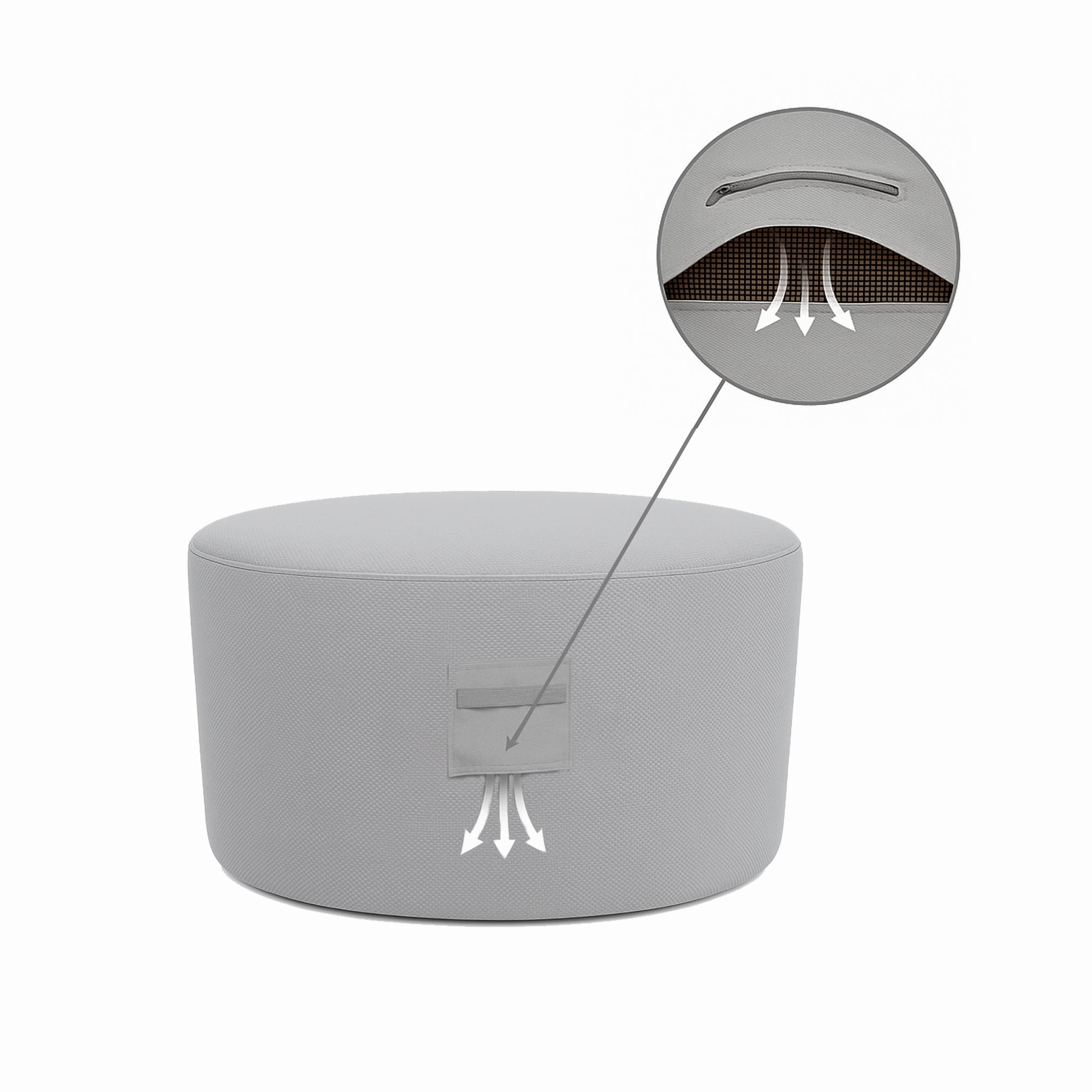 ZIPCushions' oval covers use exclusive 18 oz PVC-coated polyester. The waterproof PVC coating creates a complete moisture barrier while UV-stabilized treatment prevents sun damage and color fading. Built-in ventilation openings allow continuous airflow to prevent condensation along the elliptical surface.