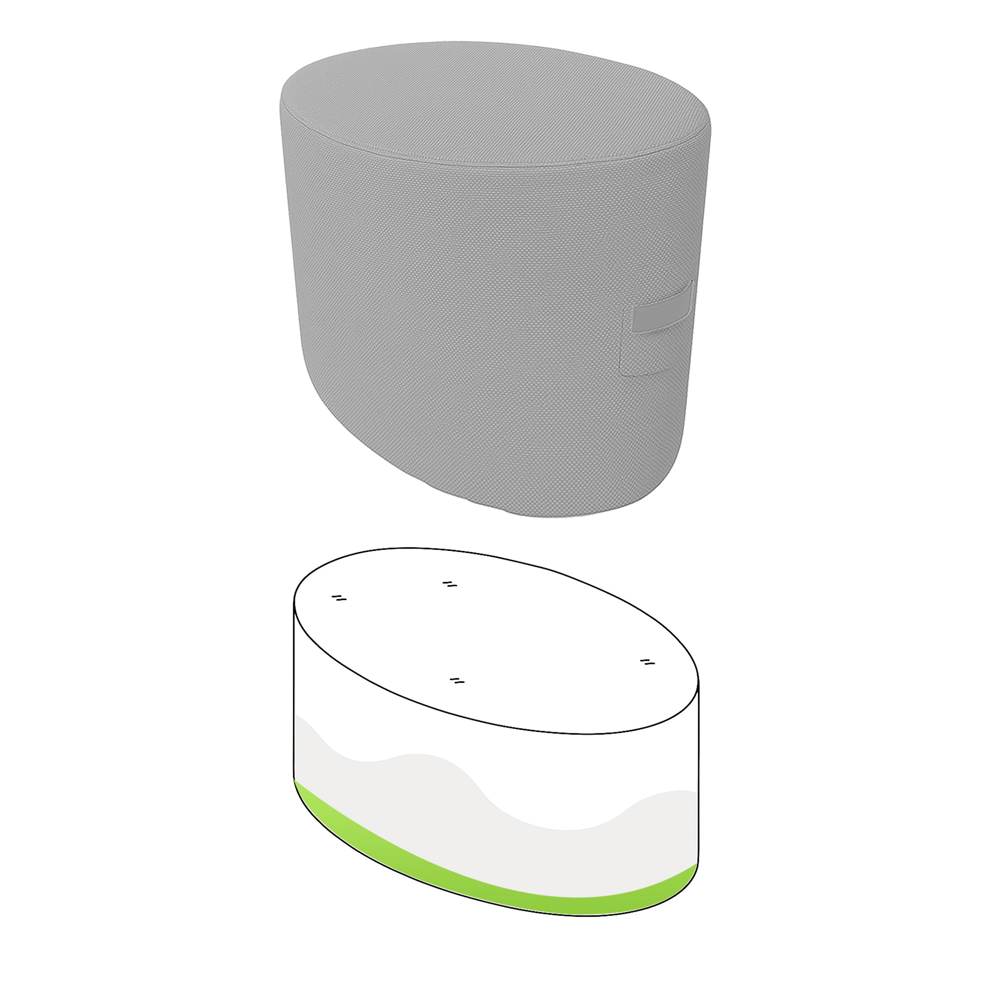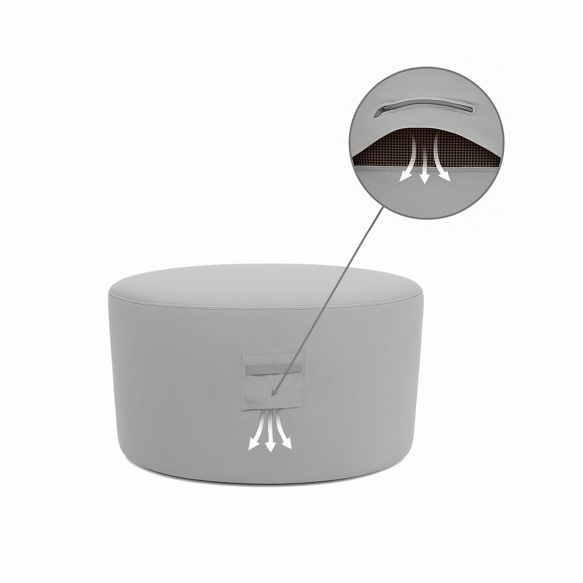 Our oval ottoman covers are constructed from 18 oz PVC-coated polyester, designed to withstand outdoor conditions throughout the year. The water-resistant coating prevents rain and moisture from reaching the upholstery and internal padding. UV inhibitors protect against sun exposure that causes fading and material breakdown. Air vents allow moisture to escape, preventing mildew growth and condensation under the cover. The smooth, curved construction follows the elliptical shape without corners, distributing fabric stress evenly around the entire perimeter and preventing the weak points common in angular designs. The adjustable drawstring hem conforms to the oval profile precisely, and built-in handles make removal and storage effortless.
