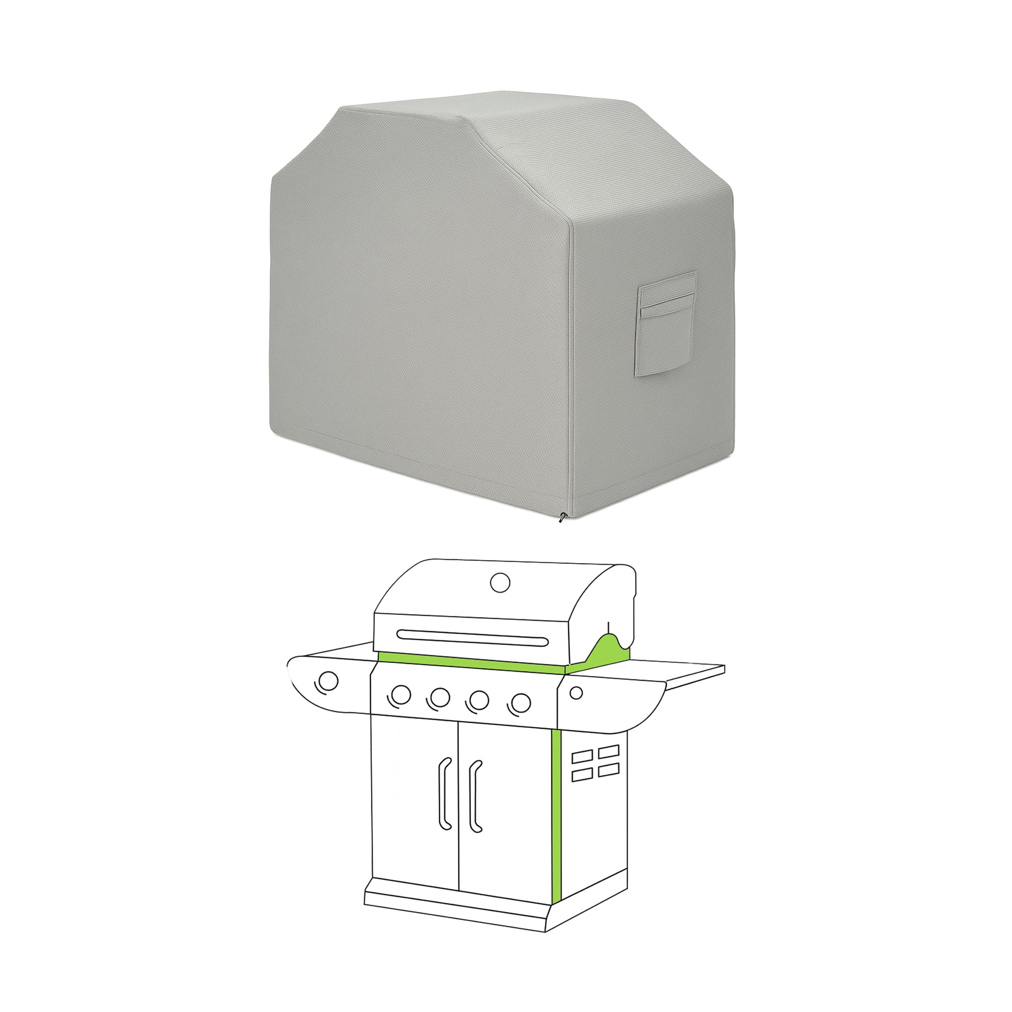 These measurements provide a perfectly tailored cover that protects your grill's cooking area, both side shelves, and storage cabinet, maintaining complete protection from top to bottom and edge to edge.