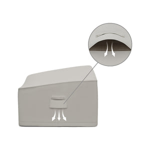 The cover's reinforced corner seams provide added strength where stress is highest, maintaining shape and fit through repeated use. Built-in air vents promote airflow underneath the cover, preventing mold and mildew that can damage wooden surfaces and fabric cushions. Dual side handles make fitting and storing the cover simple, even when working alone.
