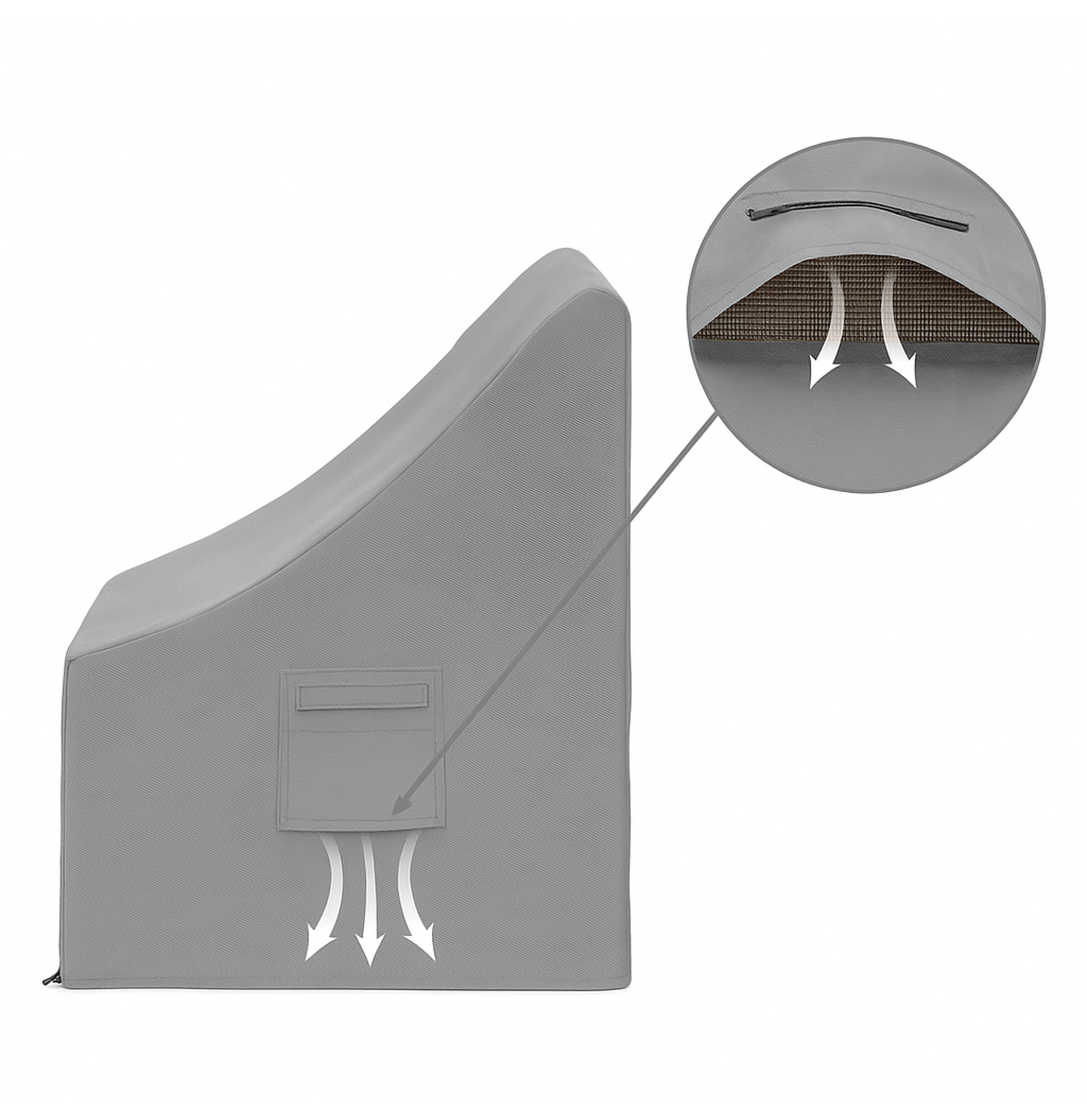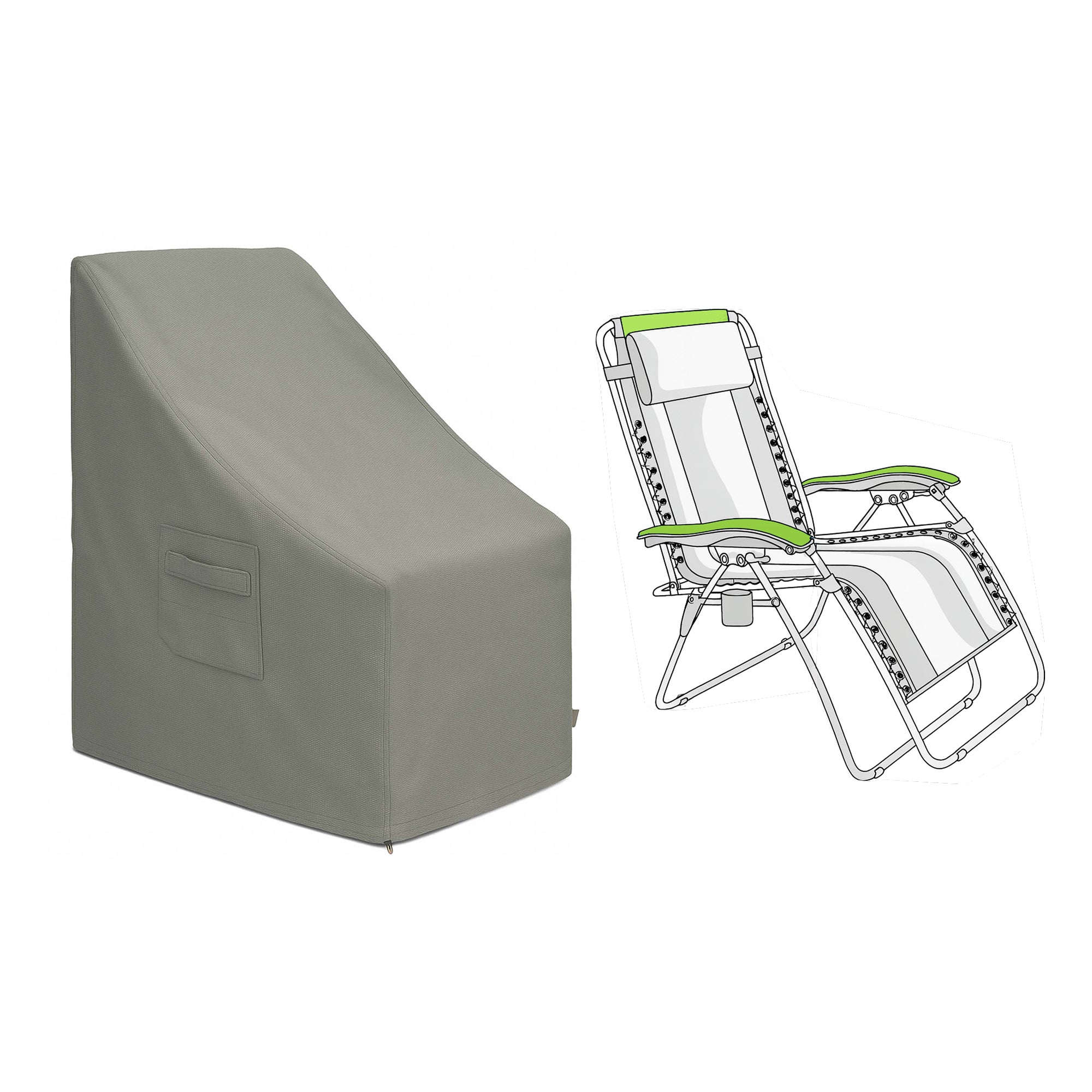 Our zero gravity chair covers are made from 18 oz PVC-coated polyester, designed to handle year-round outdoor use. The fabric is water-resistant, preventing rain from seeping in, and UV-resistant to block fading and cracking from direct sun exposure. Built-in air vents allow airflow to prevent mildew and condensation. Reinforced seams provide extra strength at high-stress areas, while an adjustable drawstring hem secures the cover in place even during strong winds. Easy-lift handles are built in for hassle-free removal and storage.