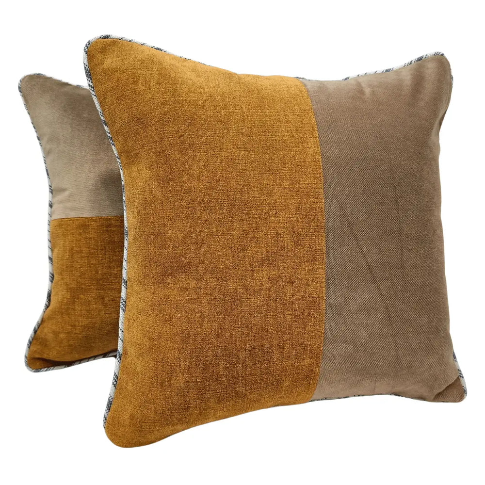 Elevate your home décor with these warm and inviting pillow covers featuring a rich blend of burnt orange, camel brown, and beige hues. The subtle patchwork design and delicate contrast piping add a refined touch, making them perfect for sofas, lounge chairs, or cozy nooks. A stylish and versatile addition to any indoor space.