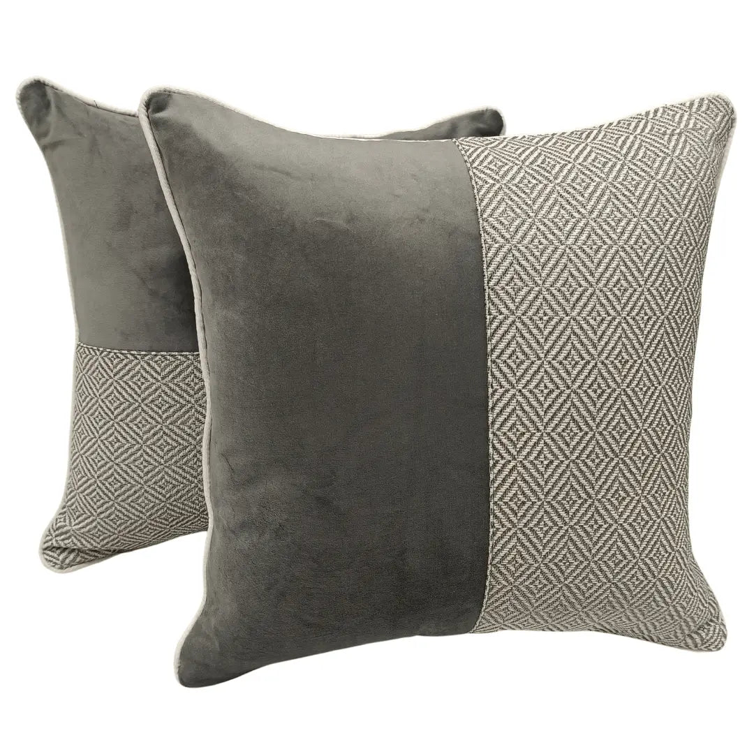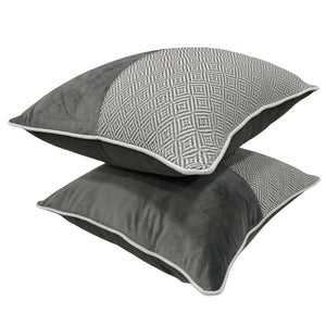Add a touch of refined style to your space with these stunning split-design pillow covers. A plush velvety gray on one side meets a sophisticated geometric pattern in white and gray on the other, creating a perfect balance of texture and contrast. Framed with crisp white piping, these covers bring a sense of understated luxury to any setting. Whether placed on a sofa, bed, or accent chair, they offer both comfort and a modern aesthetic that complements any décor.