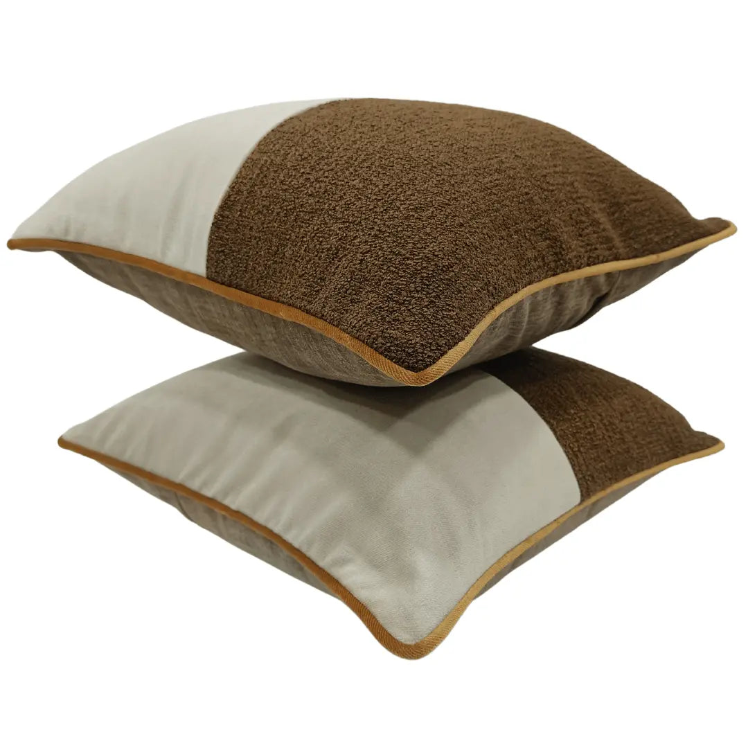 Add a refined touch to your décor with these sophisticated two-tone pillow covers. The warm brown boucle fabric beautifully contrasts with the soft beige panel, creating a timeless and stylish look. Featuring elegant piping for a polished finish, these covers are perfect for adding texture and depth to sofas, chairs, or beds. Crafted with premium materials, they offer durability and comfort for any living space.