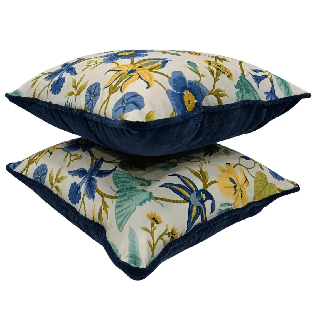 Add a touch of nature to your space with these beautifully designed pillow covers featuring a delicate floral and bird print in shades of blue, green, and gold. The deep navy piping provides a refined contrast, enhancing the elegance of these covers. Perfect for indoor décor, they complement both modern and classic interiors.
