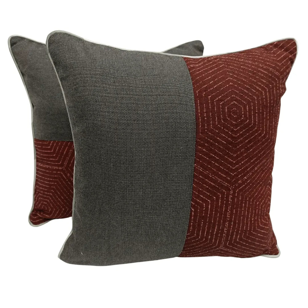 Add a bold statement to your space with these modern geometric pillow covers. The deep charcoal base contrasts beautifully with the rich red embroidered pattern, while the subtle white piping adds a refined touch. Designed for both indoor and outdoor use, these covers offer style and durability for any setting.