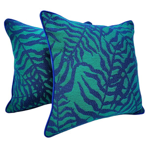 These vibrant pillow covers feature a rich green botanical pattern against a deep blue base. The bold contrast and detailed weave bring an energetic and refreshing feel to your décor.