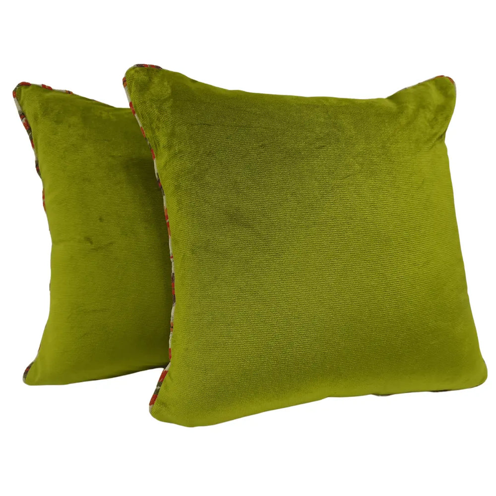 These pillow covers bring a touch of luxury with their soft velvet fabric, offering a rich texture and vibrant green hue. The contrasting multicolored piping adds a playful detail, making them a stylish accent for sofas, beds, or lounge chairs.