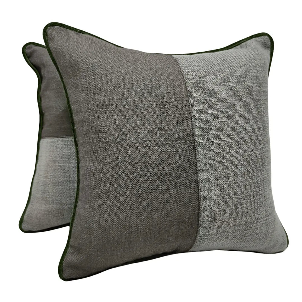 These pillow covers feature a blend of soft grey and rich blue tones, accented by green piping for a fresh and modern look. Perfect for adding a cozy and stylish touch to indoor spaces, ideal for sofas, beds, or accent chairs.