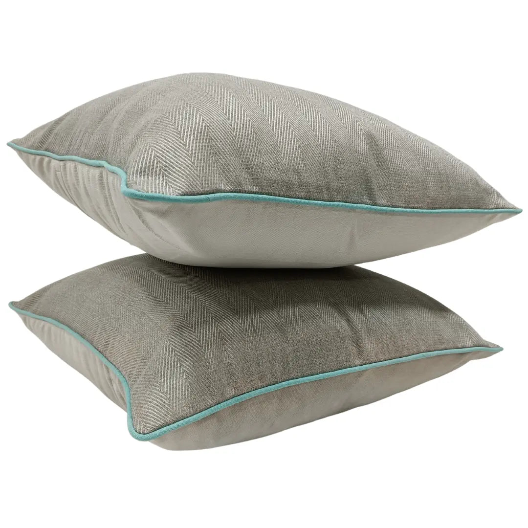 These stylish pillow covers feature a refined herringbone pattern in soft neutral tones, accented with delicate aqua piping for a subtle pop of color. The blend of textures creates an elegant and inviting look, making them an ideal choice for adding sophistication to any living space.