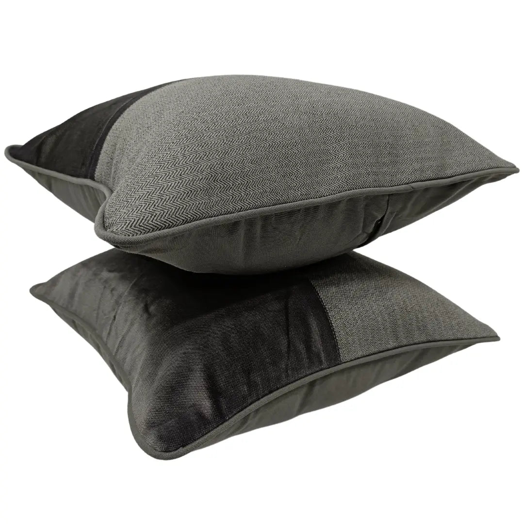 A mix of herringbone texture and soft velvet in deep grey tones gives these pillow covers a sophisticated, layered appeal. The elegant contrast of fabrics and subtle piping make them a stylish addition to any refined home setting.