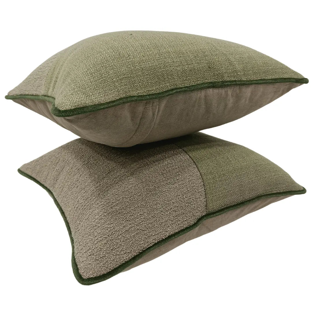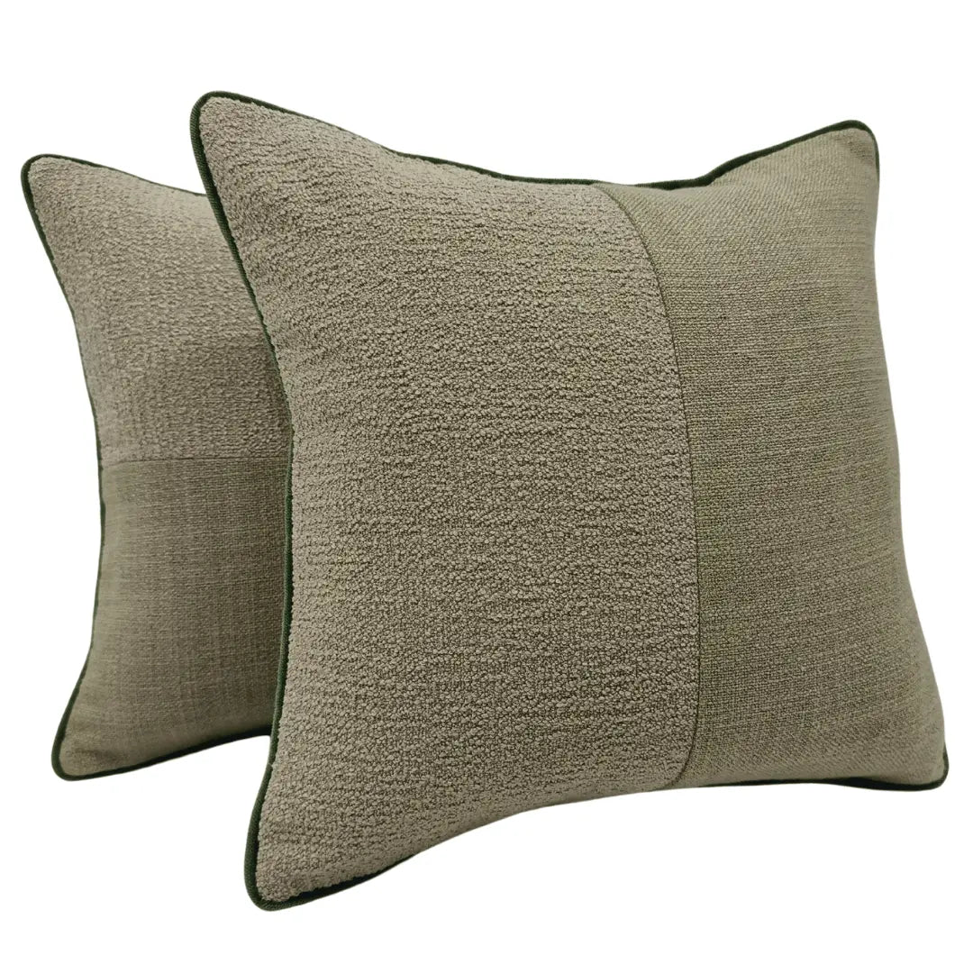 Bring a natural, earthy touch to your home with these Olive Green & Beige Textured Pillow Covers. Featuring a rich mix of boucle and woven fabric, these covers offer both comfort and style. The subtle green piping enhances the design, making them a perfect addition to any living space. Ideal for indoor use, great for sofas, armchairs, or cozy reading nooks.