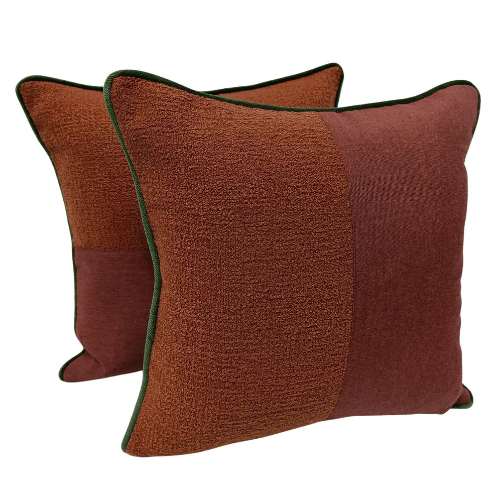 Elevate your home décor with this stunning set of 16x16 pillow covers, designed for indoor use. Featuring a rich blend of warm brown and deep red tones with a textured finish, these covers add depth and sophistication to any space. The contrast green piping enhances the design, making them a stylish addition to your living room, bedroom, or lounge area. Soft, durable, and easy to maintain, they are perfect for adding a cozy touch to your interiors.