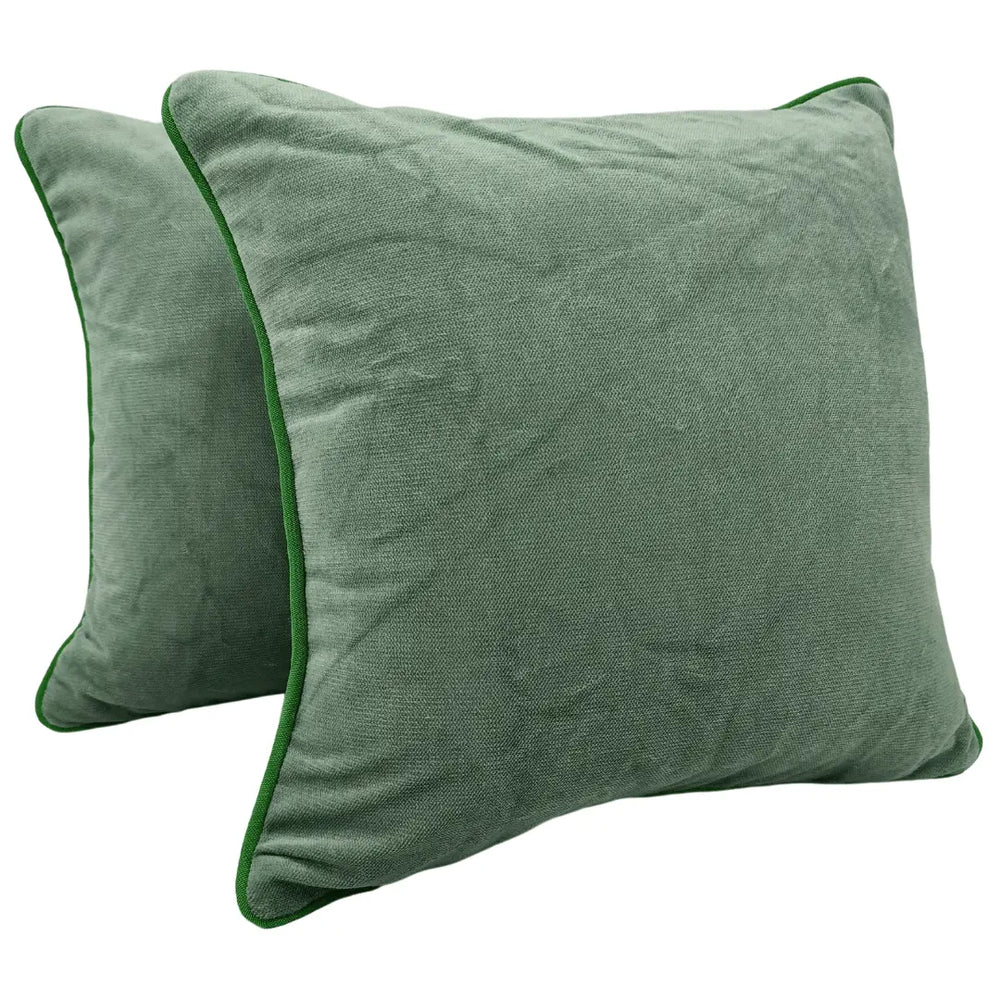 Add a refreshing touch of elegance to your indoor space with these sage green velvet pillow covers. Crafted from royal velvet fabric, they offer a soft, plush feel with a subtle sheen that enhances their luxurious appeal. The deep green piping adds a refined contrast, making them a perfect accent for sofas, beds, or lounge chairs. Elevate your décor with comfort and style in one chic package.