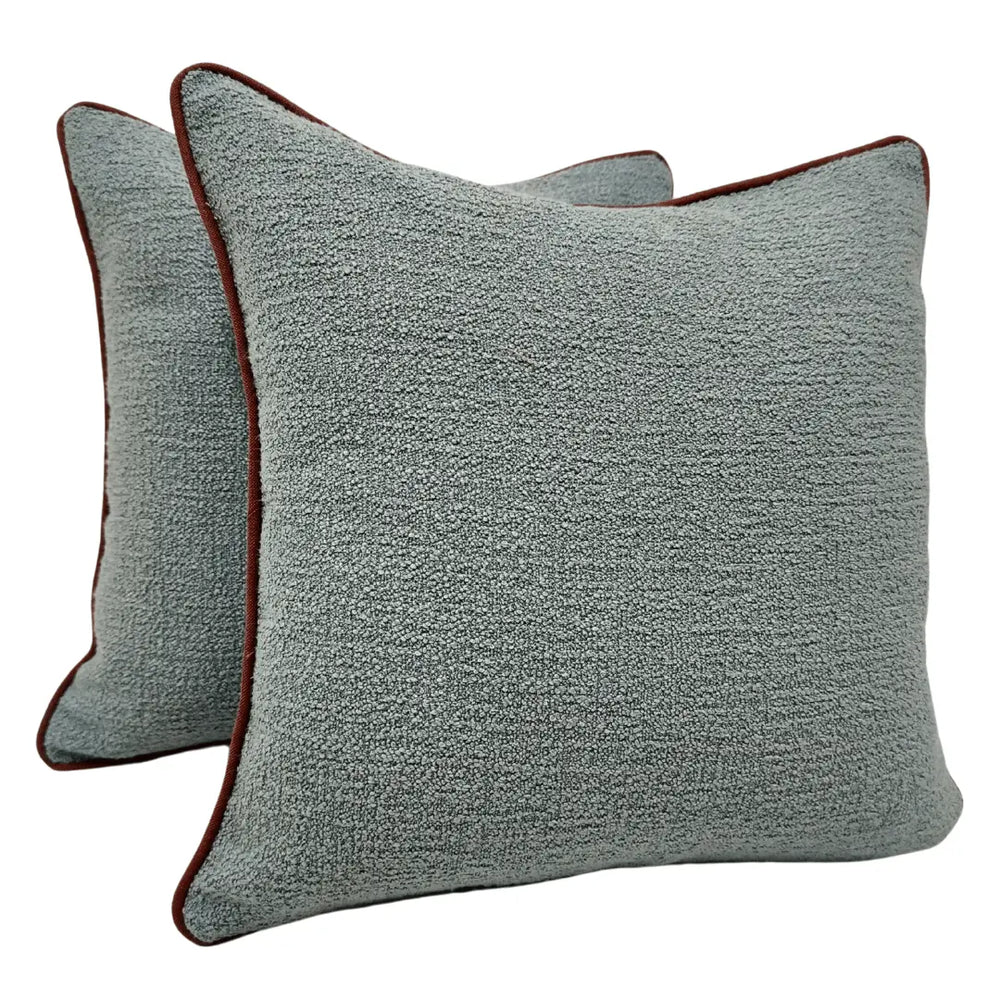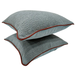 These pillow covers feature a soft, textured bouclé fabric in a calming grey hue, accented by warm rust piping. Perfect for adding a cozy and modern touch to indoor spaces, ideal for sofas, beds, or reading nooks.