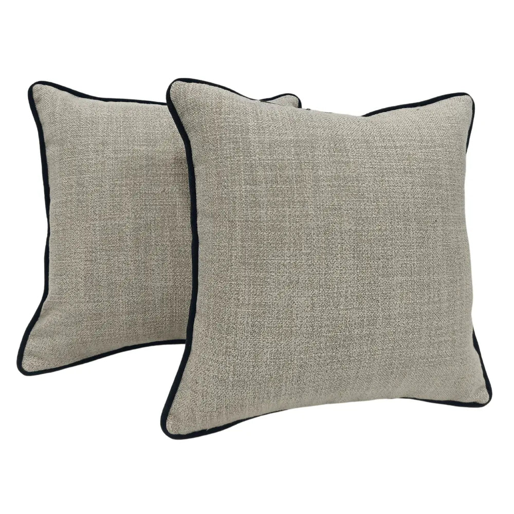 Elevate your space with these sophisticated neutral pillow covers, featuring a rich textured fabric and striking black piping. Designed for indoor use, they offer a refined contrast that complements modern, minimalist, and classic interiors alike. A perfect blend of elegance and comfort for any setting.