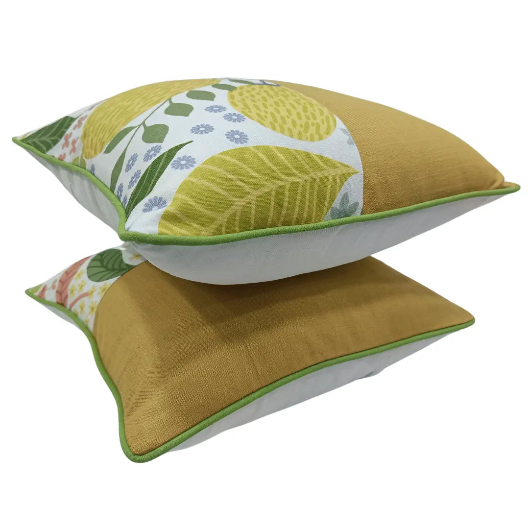 Bring a burst of nature-inspired charm to your space with these vibrant pillow covers. Featuring a lively tropical leaf and floral print on one side and a warm mustard-toned fabric on the other, they offer a perfect balance of color and texture. The soft green piping enhances the design, making them a refreshing accent for any indoor setting. Ideal for brightening up your living room, bedroom, or cozy nook.