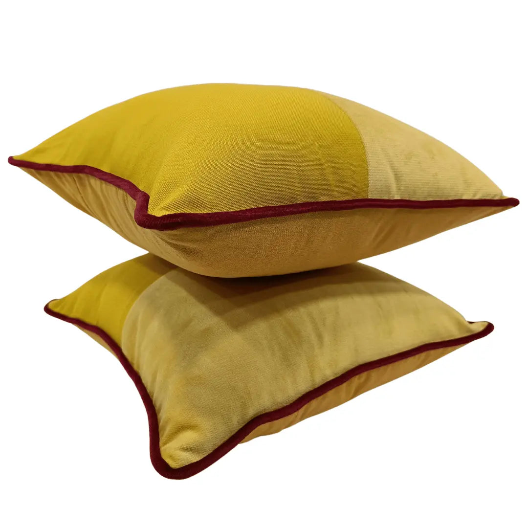 Brighten up your space with these stylish mustard pillow covers featuring a subtle fabric contrast and bold maroon piping. Designed for indoor use, they fit 16x16 inserts perfectly, adding a cozy and modern touch to sofas, chairs, or beds.