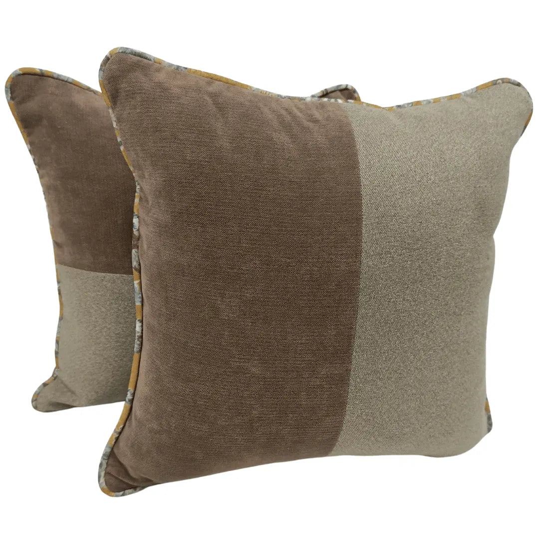 Bring warmth and texture to your indoor space with these stylish pillow covers. The rich brown and soft beige panels create a balanced contrast, while the patterned piping adds a subtle decorative touch. Perfect for layering on a sofa or bed, these covers enhance your décor with their cozy yet refined design.