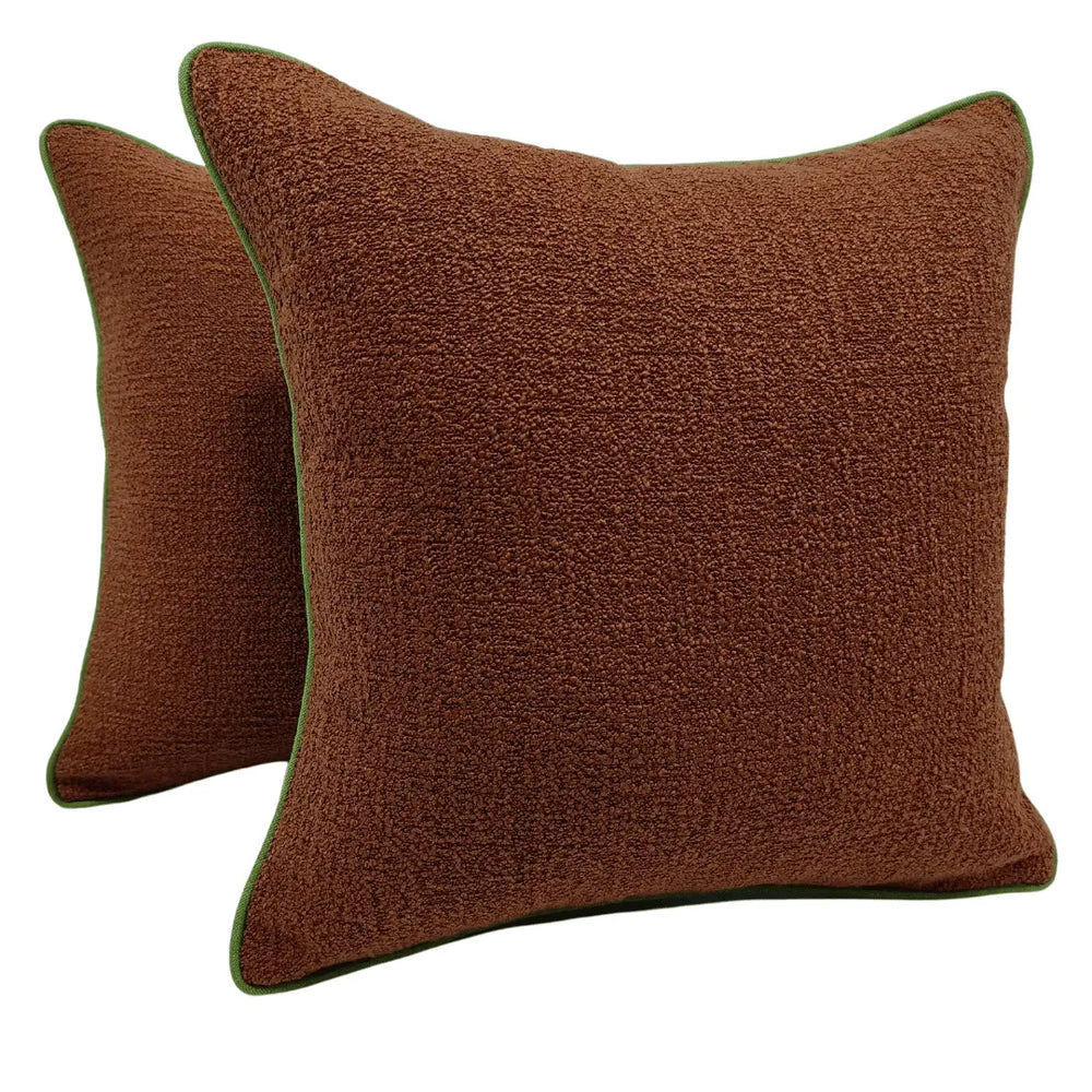Add a touch of warmth and sophistication to your space with these rich cocoa-toned pillow covers. The textured fabric enhances depth, while the subtle green contrast piping provides a stylish accent. Perfect for cozy living rooms, bedrooms, or reading nooks, these pillow covers complement both modern and classic décor.